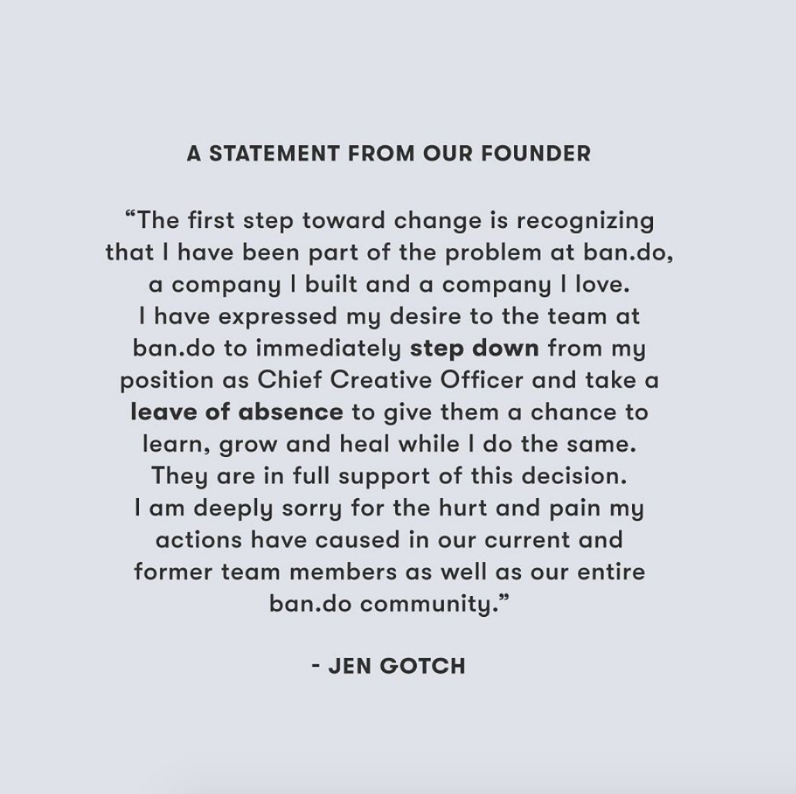 These cries of foul play continued over at brands Bando, whose CCO Jen Gotch admitted to saying and doing racist things. She is taking a leave of absence to “learn, grow, and heal.