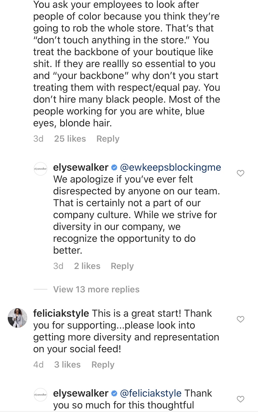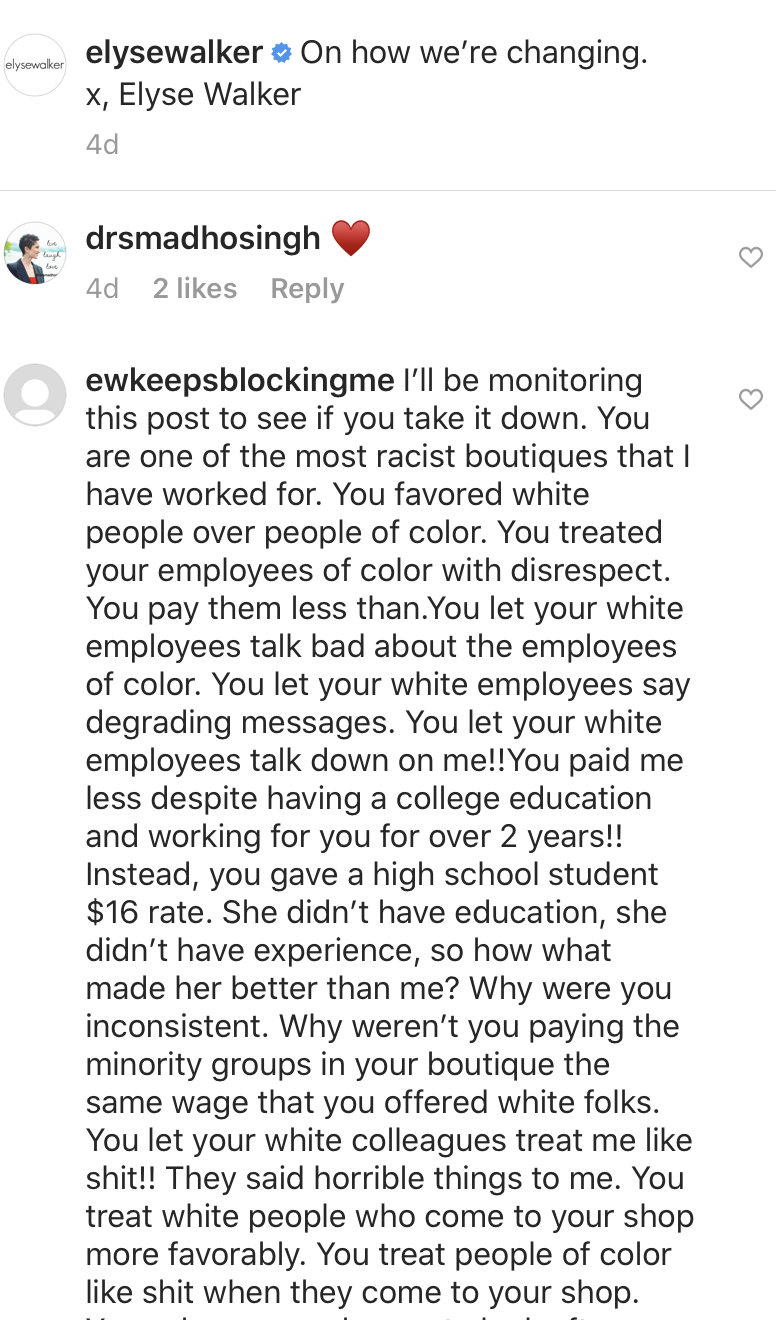 In a follow up post on @ElyseWalker‘s page, called Change, an anonymous user (who noticed their comments kept getting deleted so created the name @EwKeepsBlockingMe) wrote,” I’ll be monitoring this post to see if you take it down. You are one of the most racist boutiques that I have worked for. You favored white people over people of color. You treated your employees of color with disrespect.” Read more below: