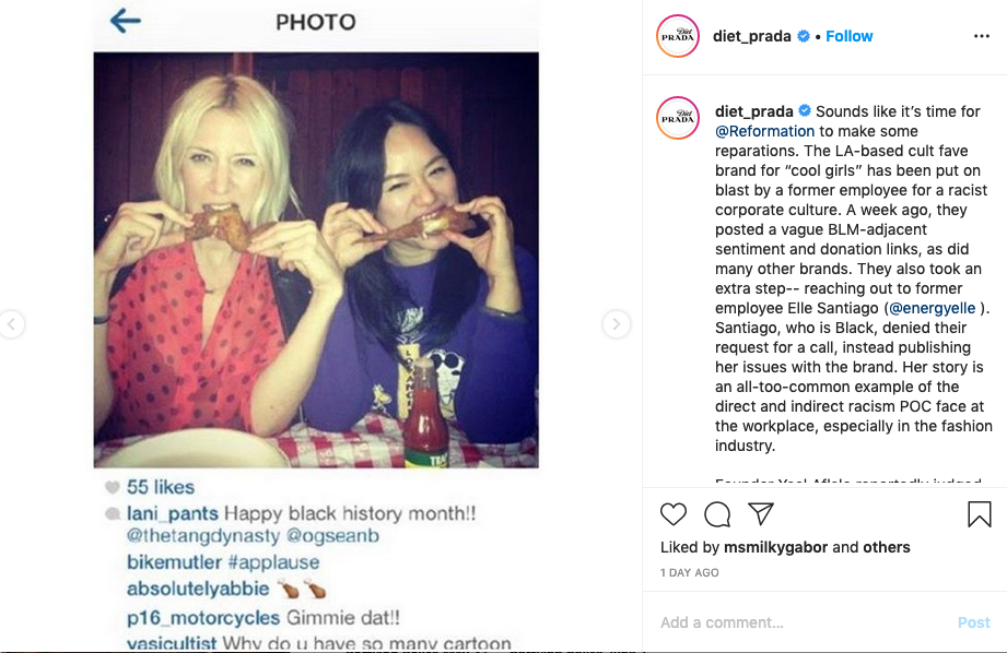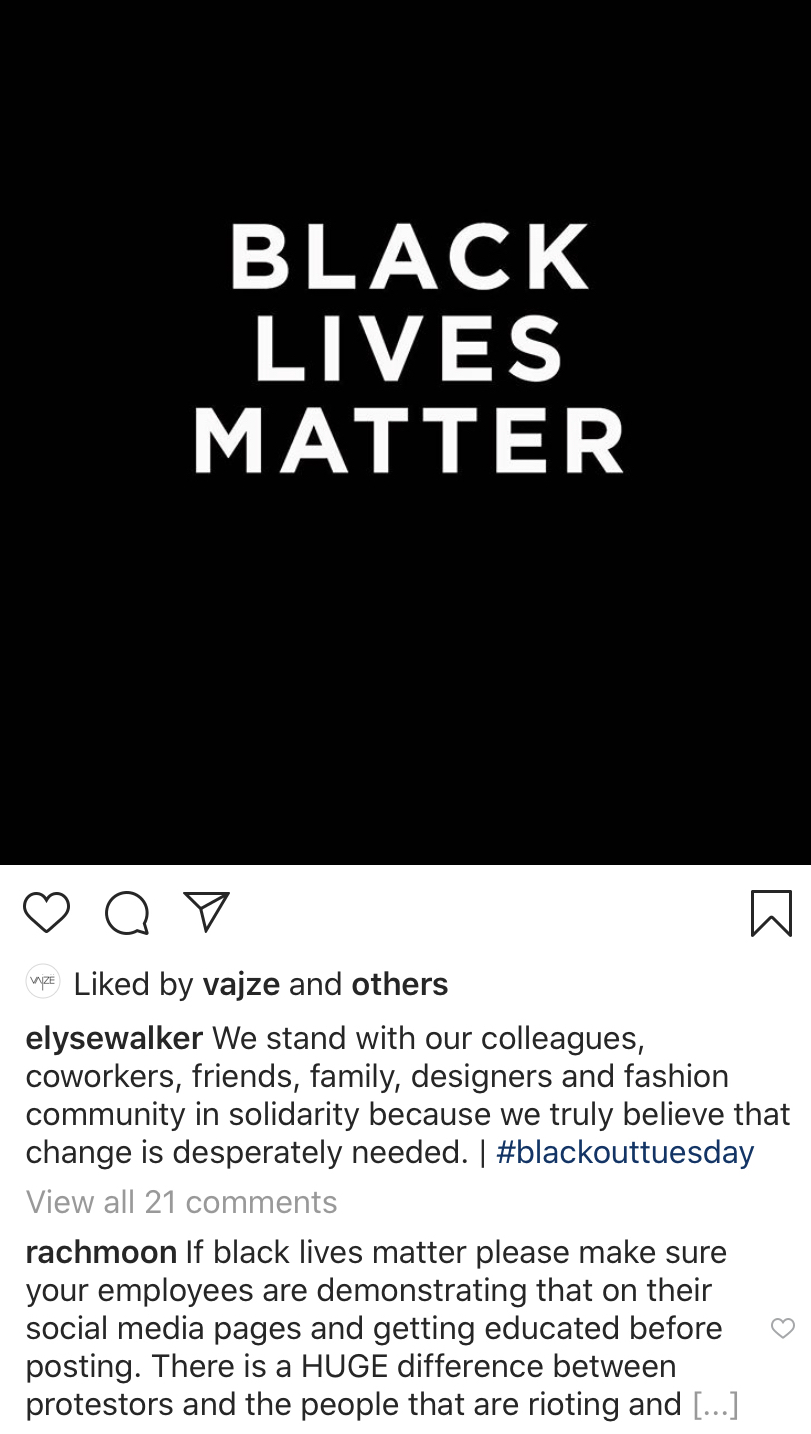 While their social media posts portray that they care about the movement for racial equality, comments left by former employees portend that they don’t walk the walk in real life. Under Elyse Walker’s #BlackLivesMatter Post, @RachMoon wrote, “If black lives matter please make sure your employees are demonstrating that on their social media pages and getting educated before posting.”