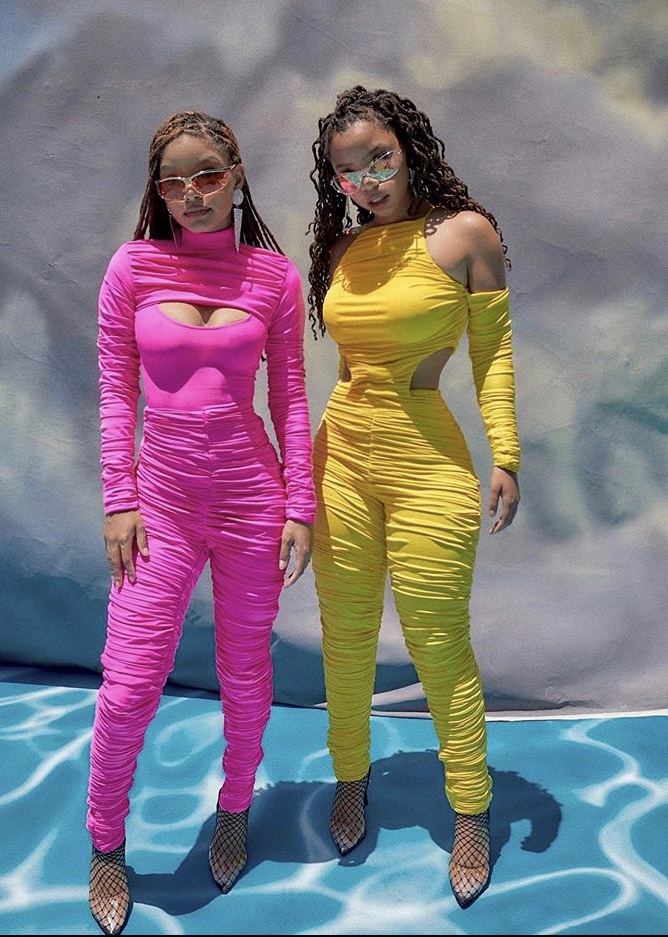 Chloe wore a long sleeved neon yellow ruched cat suit with exposed shoulders and side cut outs. Halle rocked a long sleeved neon pink ruched cat suit. It has a wide key hole cut out with a high neckline.