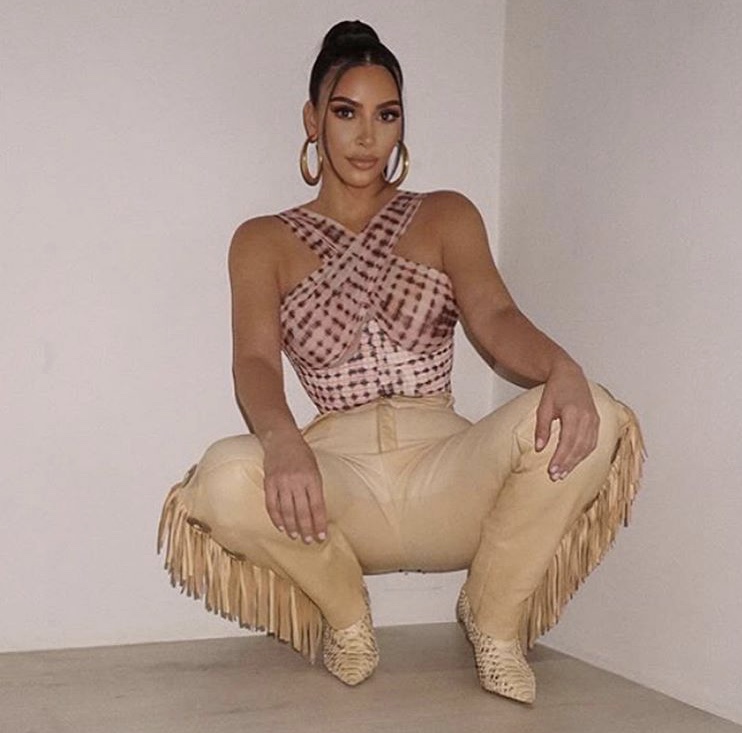 Kim Kardashian rocked her top with beige Roberto Cavalli fringe pants and Yeezy snakeskin boots.