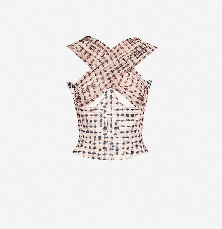The chic halter has a corset like bodice with boning at the front and sides, along with a high V neckline and crisscross off the shoulder straps.