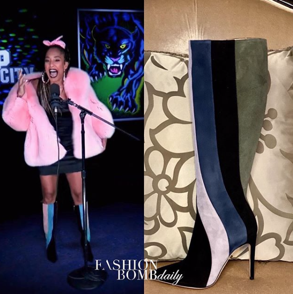 Seales accessorized a pink coat an LBD with $595 Tori Soudan striped Greta boots.