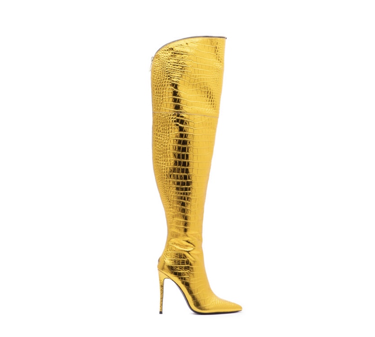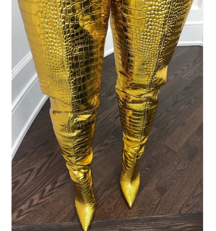 She paired it with Jennifer Le’s gold leather thigh high Caiman II (24k) boots and she was styled by NoIGJeremy.