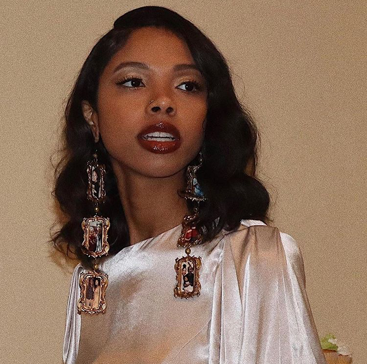 She paired it with earrings featuring photos of victims of police brutality such as George Floyd and Breonna Taylor. The dangling picture frame like earrings were inspired by designer Beads Byaree, a designer featured in our 2nd list of 100 Black Designers You Should Know. She was styled by Mikiel Benyamin.