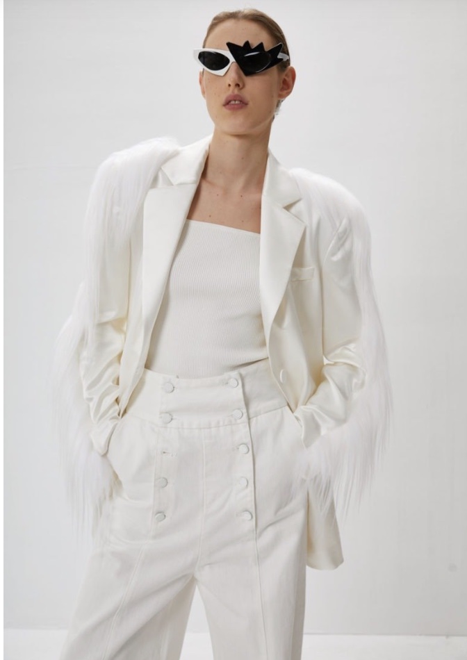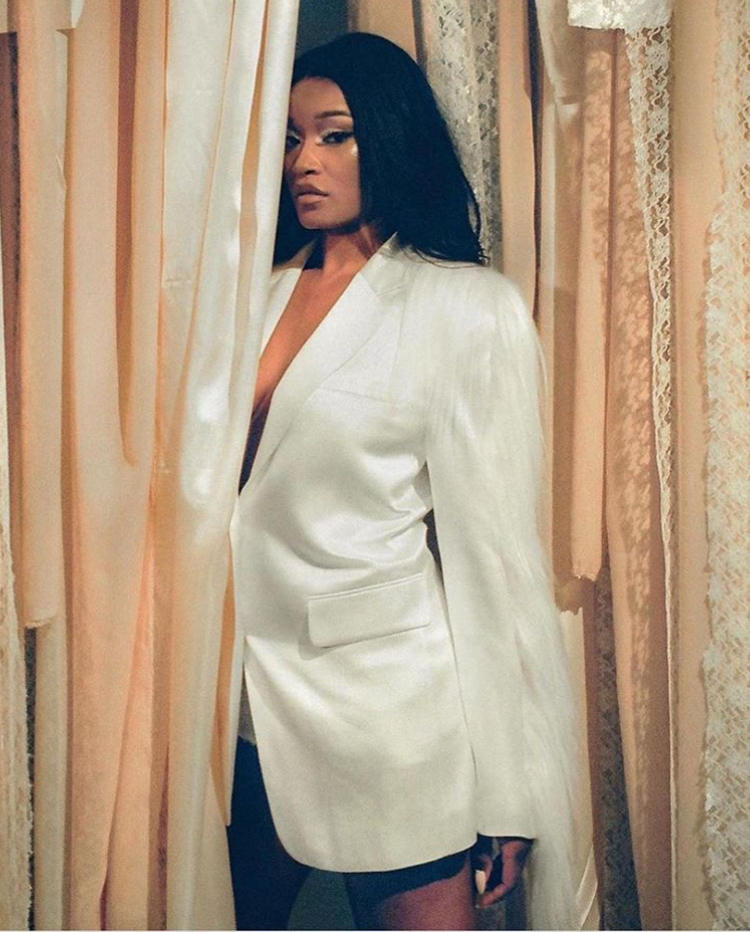 Keke Palmer posed for a photoshoot, shot by photographer Peggy, wearing a white wool blazer by Annakiki. The blazer was worn as a dress that fell mid thigh on the young actress. The sleeves on the blazer are accented with wool from the shoulders to the wrist, giving a fringe like effect and adding volume to the ensemble.