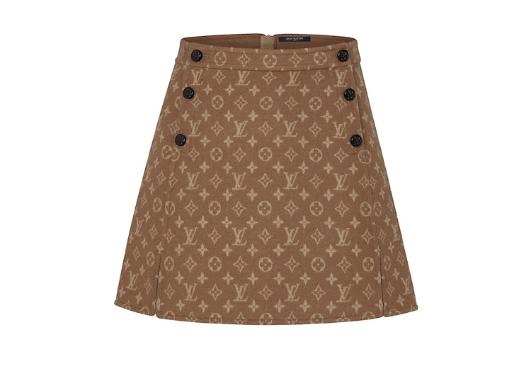 It was paired with the original skirt, a classic Louis Vuitton piece. This double face A-line mini skirt in wool and silk features the iconic Monogram motif as an allover pattern in contrasting colors. Subtle slits at the front and back add ease of movement, while button details on the front highlight the sharp silhouette. – Louis Vuitton