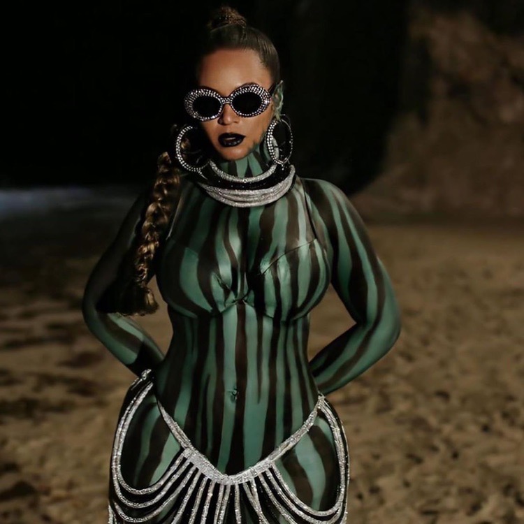 Laurel Dewitt also created the neck and hip pieces worn in a scene with Beyonce dancing while covered in green and black body paint. HOT!