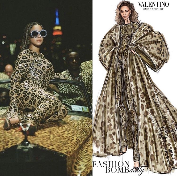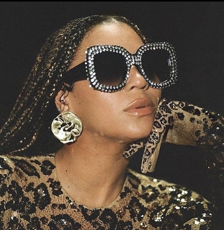 Beyonce poses on a leopard print car in a custom Valentino Haute Couture leopard print gloved jumpsuit designed by Valentino creative director Pierpaolo Piccioli. It was paired with A-Morir‘s over sized square framed hand adorned blacked plated crystal chain “Pebbles” glasses.
