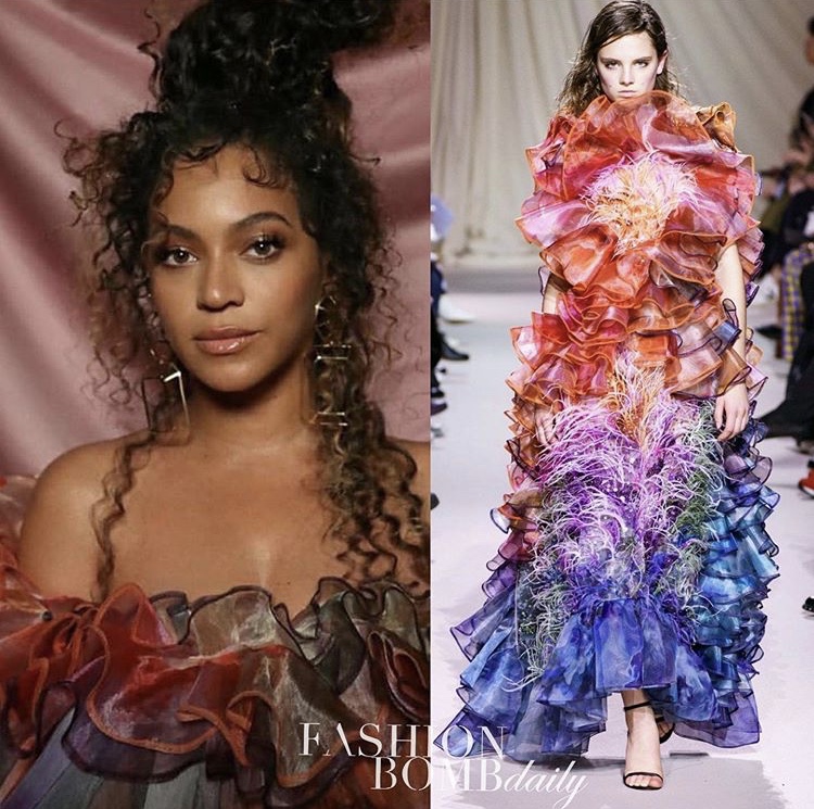 Beyonce sings beautifully in a yellow off the shoulder Balmain top from their Spring 2020 collection.