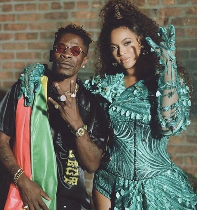 Beyonce posed with Ghanaian star Shatta Wale in a custom 5:31Jerome hand beaded Nigerian lace and silk trench/jumper hybrid paired with black razor sharp sunglasses and a Sarah Sokol Millinery hat. Shatta Wale is wearing Project 96.