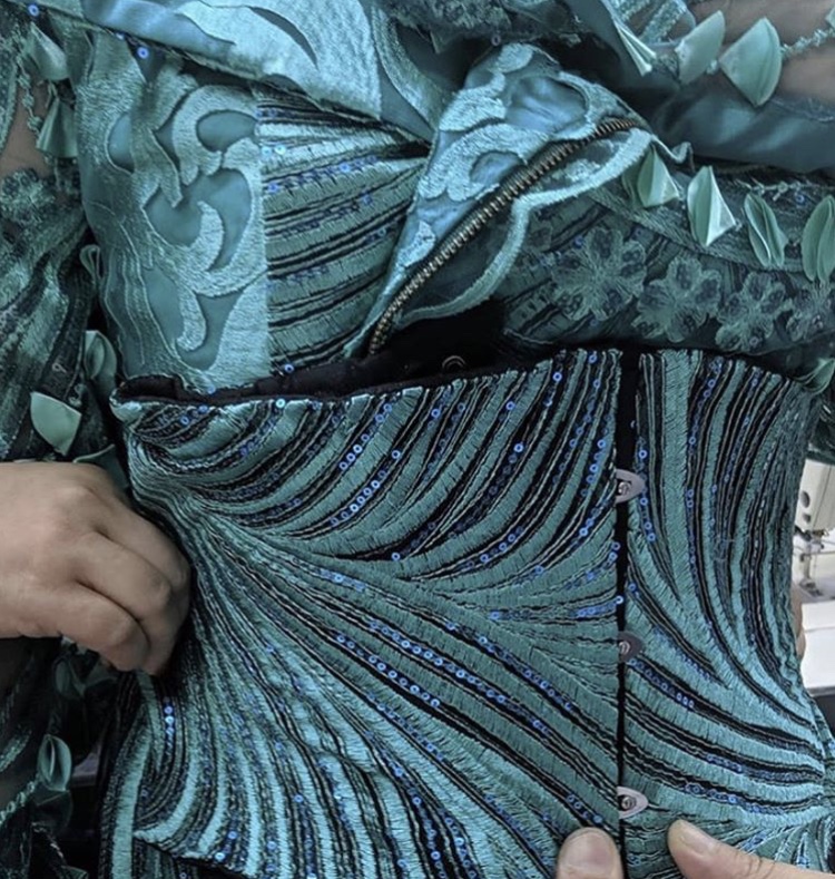 This stunning black feathered piece was created by Mr. Ashi of Ashi Studio. It took him 70 hours to create this memorable look. Ashi stated the exotic feathers were placed one by one on the bodice.