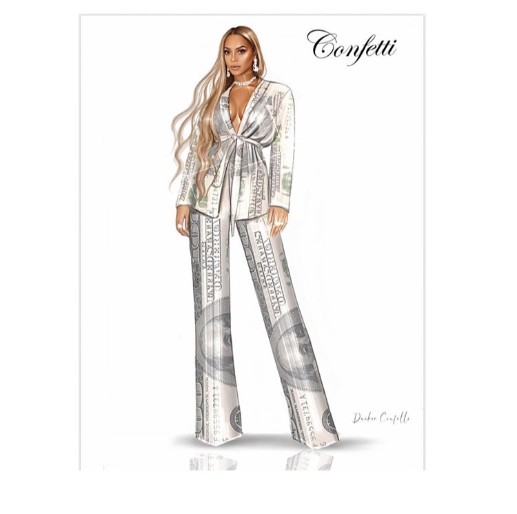 Duckie Confetti also worked with Beyonce designing the “Mood 4 Eva Money Print Pajamas worn during the premiere. Bomb!