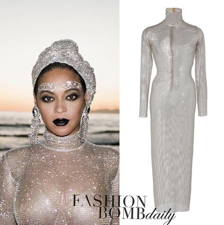 Beyonce shimmered wearing a 5,850 Crystal Net dress paired with Crystal Cascade earrings by Alessandra Rich.