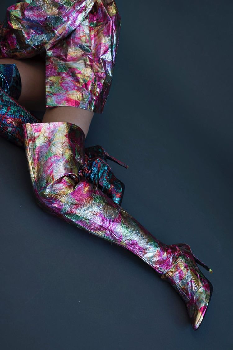 Another dazzling creation was a multicolored, vertical striped, custom crystal dress by Vrettos Vrettakos. Boots by Tsakiris Mallas and a Laurel Dewitt custom rope neck piece completed the look.