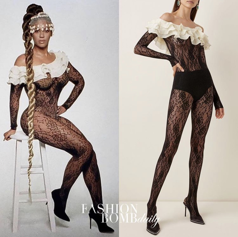 Beyonce perched wearing a $174 Alessandra Rich lace jumpsuit and a cowrie headpiece by La Falaise Dionn.