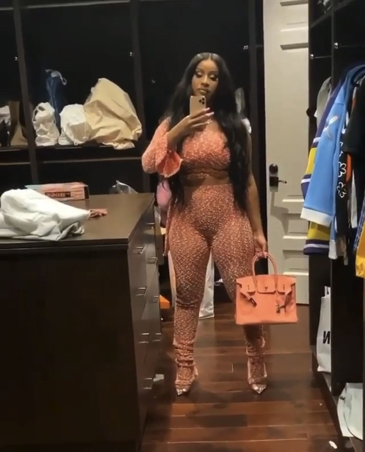 Cardi B was spotted out in a Dionne by T. Dionne “Shortcake” set (sold out) matched with a Hermes Taurillon Clemence Birkin 30 Crevette (sold out) and Jessica Rich heels.