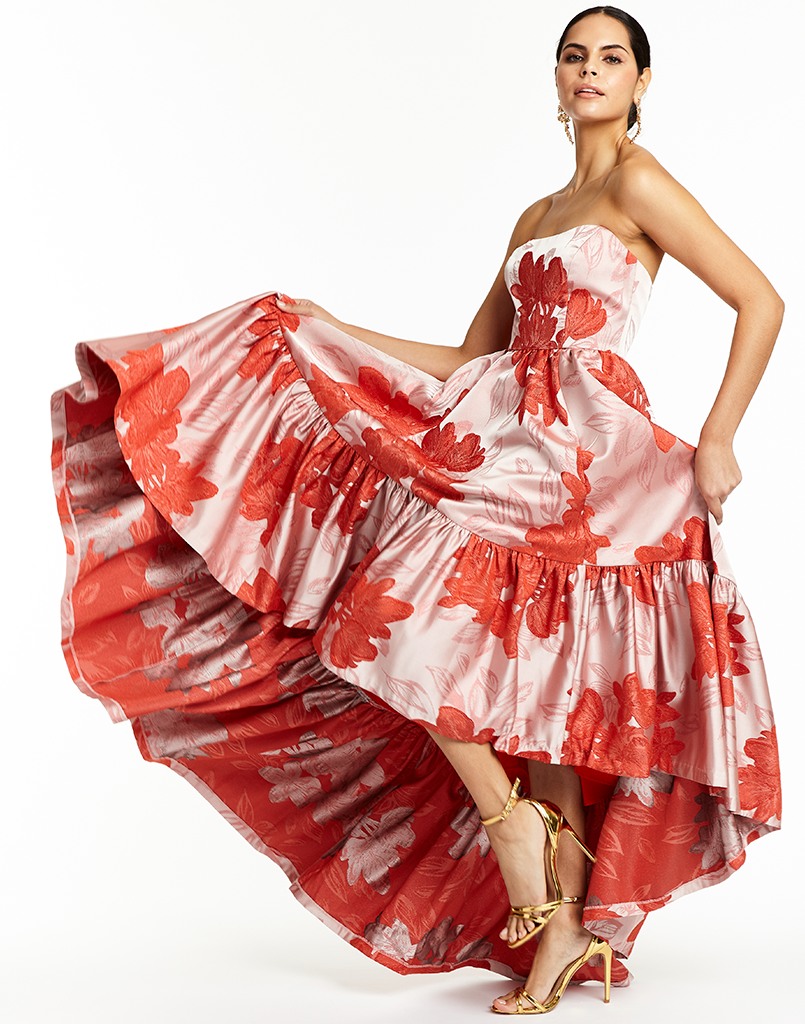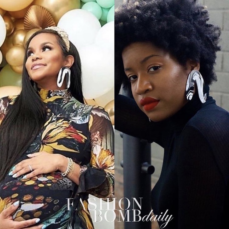 For her maternity photos, Letoya glowed as she wore a $626 red and pink floral print “Georgina” gown by Mestiza which is currently sold out. The powder pink hat and matching earring set this look off, as she posed on a white staircase shoe-less.