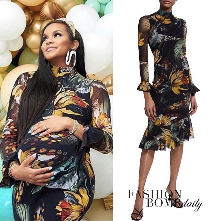Letoya Luckett-Walker looked lovely as she took to Instagram for a virtual baby shower. During the celebration of her unborn son baby Walker, Letoya rocked a $595 jungle-print mock-necked ruffle dress by Fuzzi. The dress fell just below the knee and featured an array of colors such as green red yellow and black.