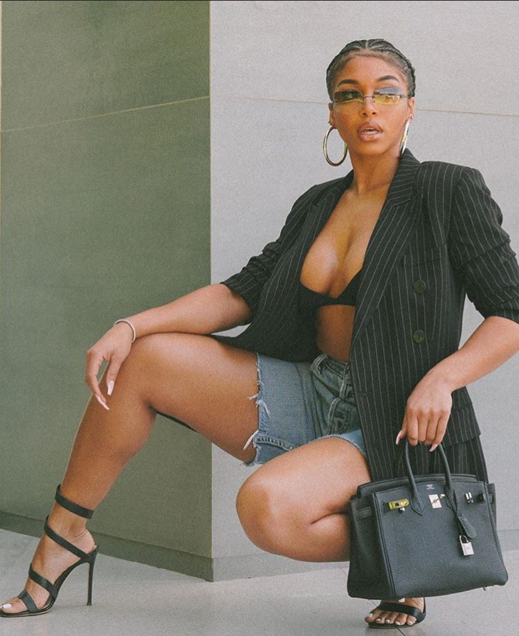 Lori Harvey posed for Instagram wearing a vintage Jean Paul Gaultier ruched sleeve pinstriped blazer purchased from Pechuga. She wore the blazer open exposing a black bikini top by Givenchy.