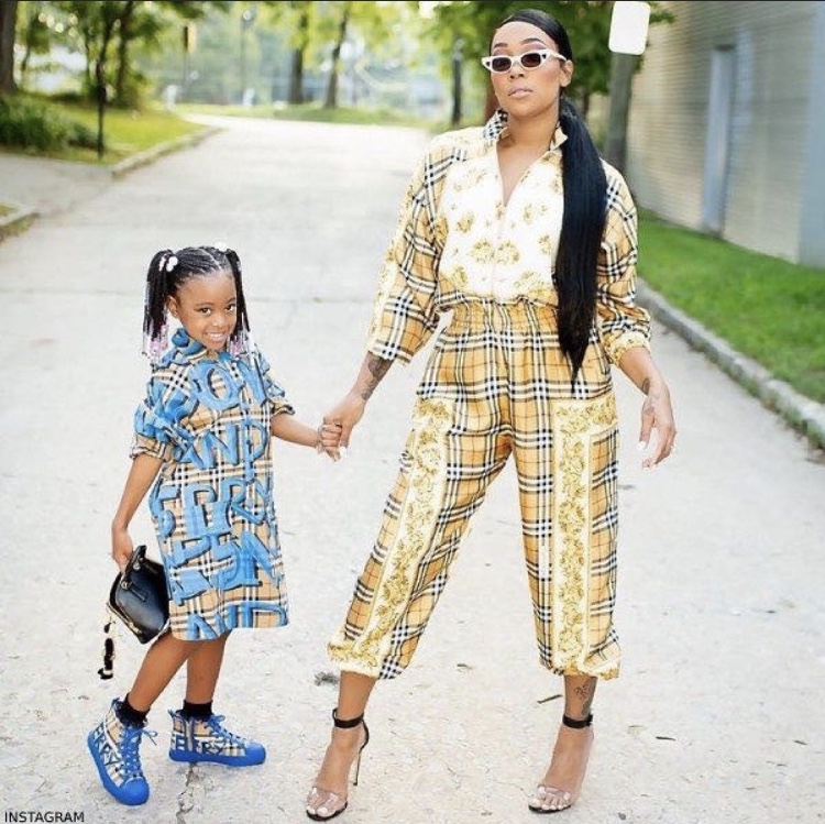 She posed again with her daughter rocking a not so traditional $1,500 Vintage Silk Burberry Jumpsuit while her daughter wore Erina Mini Me Vintage Check Graffiti Shirt Dress and $238 matching sneakers.