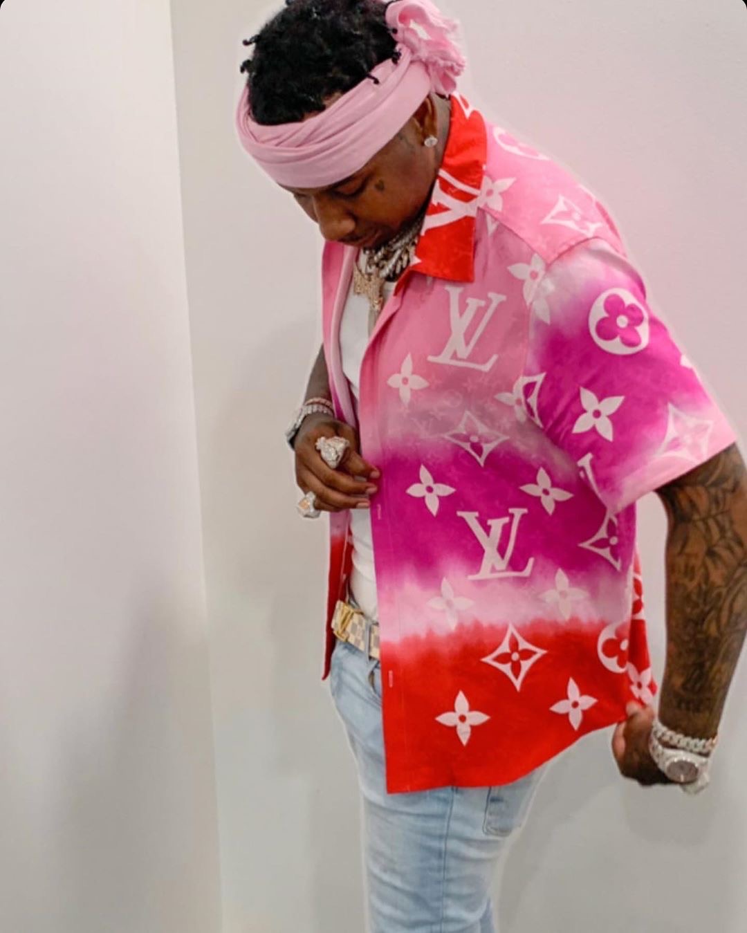 Moneybagg Yo wore a custom Louis Vuitton button shirt by Exclusive Game to match Ari’s Louis Vuitton Escale Onthego GM bag. He completed the look with Amiri jeans, headband/headwrap by Jeff Austin, Louis Vuitton Damier Belt and Air Jordan 7 “Hare 2.0” sneakers.