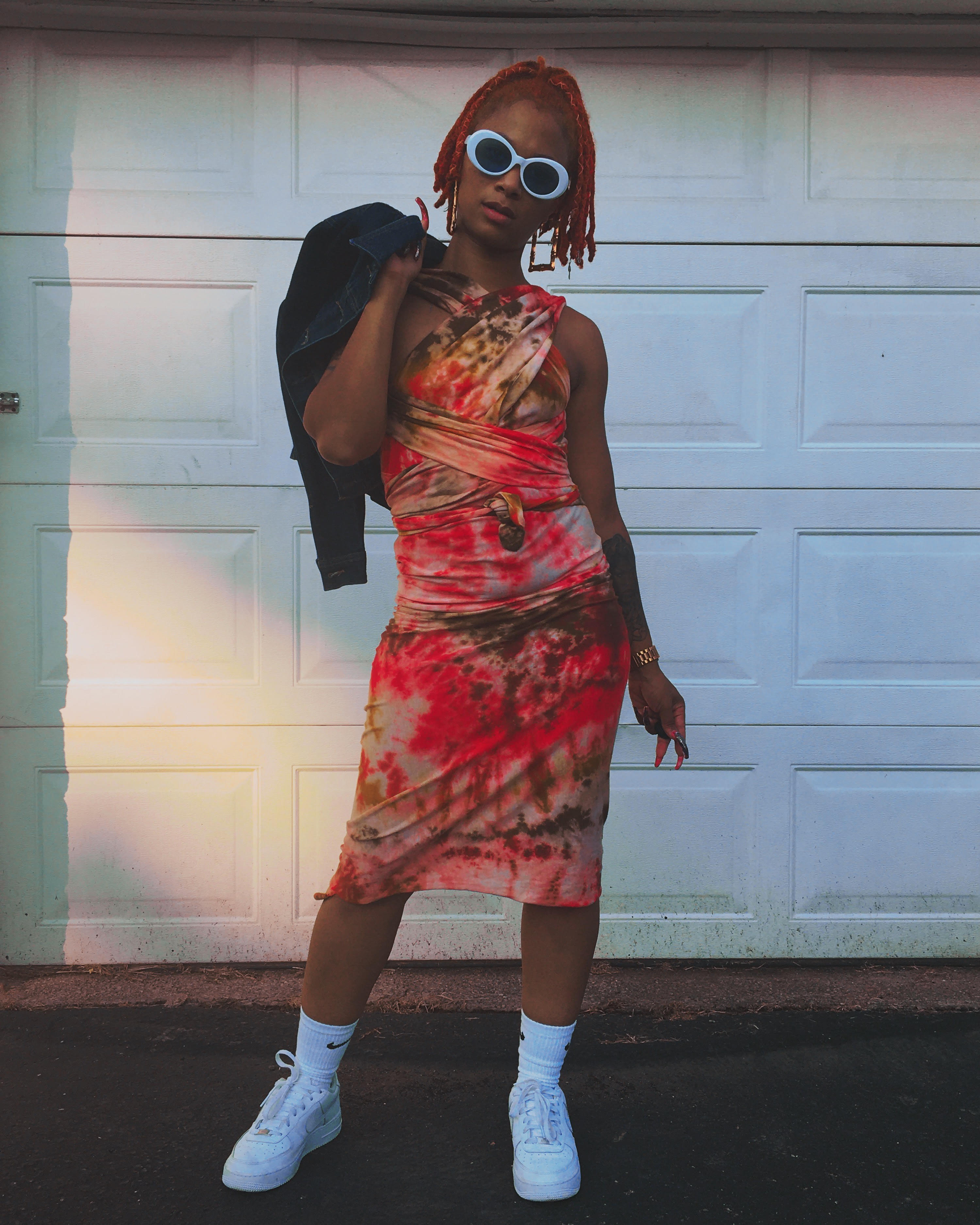 Erica (@thesewhouse) kept it edgy chic with her tie-dye dress paired with white sneakers and sunnies along with a black denim jacket!