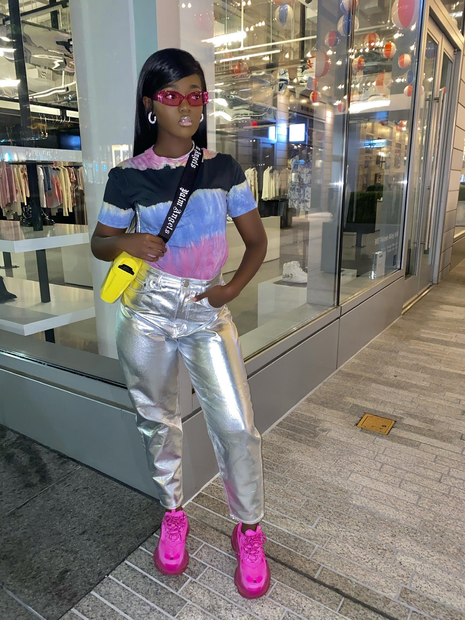 Naya (@nayaashley) rocked a tie-dye t-shirt with shiny silver pants accessorized with hot pink Balenciaga Triple S sneakers and a yellow Palm Angels Padlock bag!