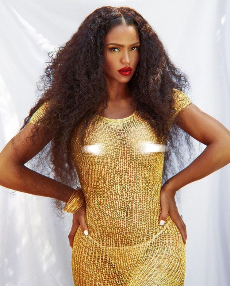 Cassie glowed in gold as she celebrated her birthday. She posted photos wearing a handmade gold chain single slit dress by Natalia Fedner. This ‘metal couture’ ensemble is a head turner and can be dressed up or down. Cassie rocked it with a bold red lip and wild natural hair.