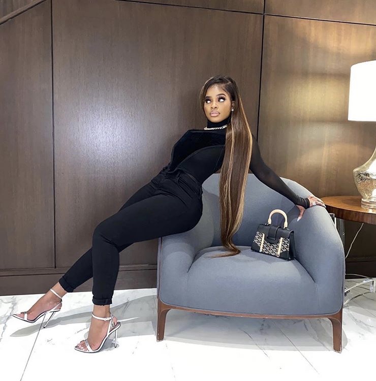 She paired the all black ensemble with Tom Ford’s $1,600 Padlock open toe silver tone leather sandal and $3,995 mini Goyard Saigon bag