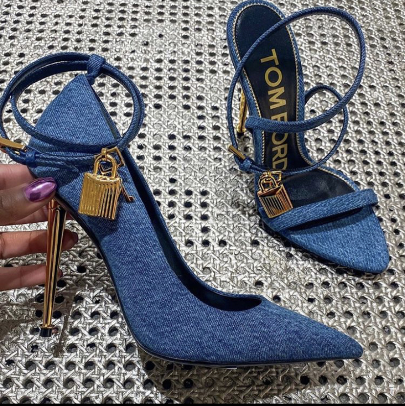 The new must have heels for Fall? Tom Ford’s classic Padlock Pumps and Sandals, cast in delectable denim.