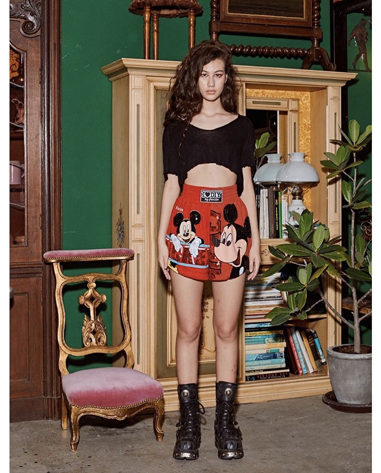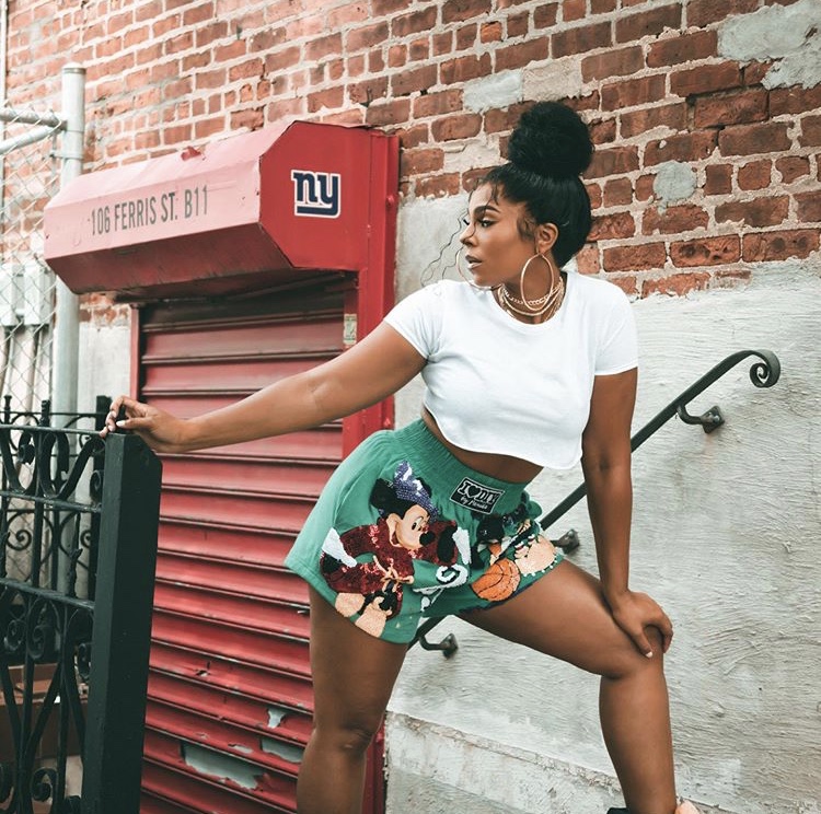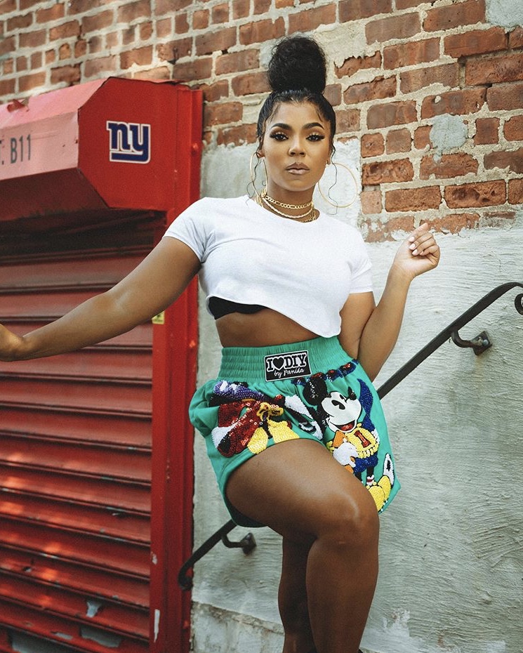 Ashanti posed for the Gram wearing $200 green upcycled cartoon boxer shorts by Pandia. The boxing trucks featured different textured images of Mickey Mouses from different eras.
