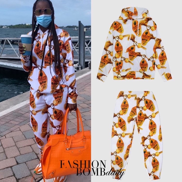 Issa Rae showed off her Aliette by Jason Rembert (her right-hand stylist) Resort 2020 outfit and orange Balenciaga City S bag before taking off to a resort in Bermuda.