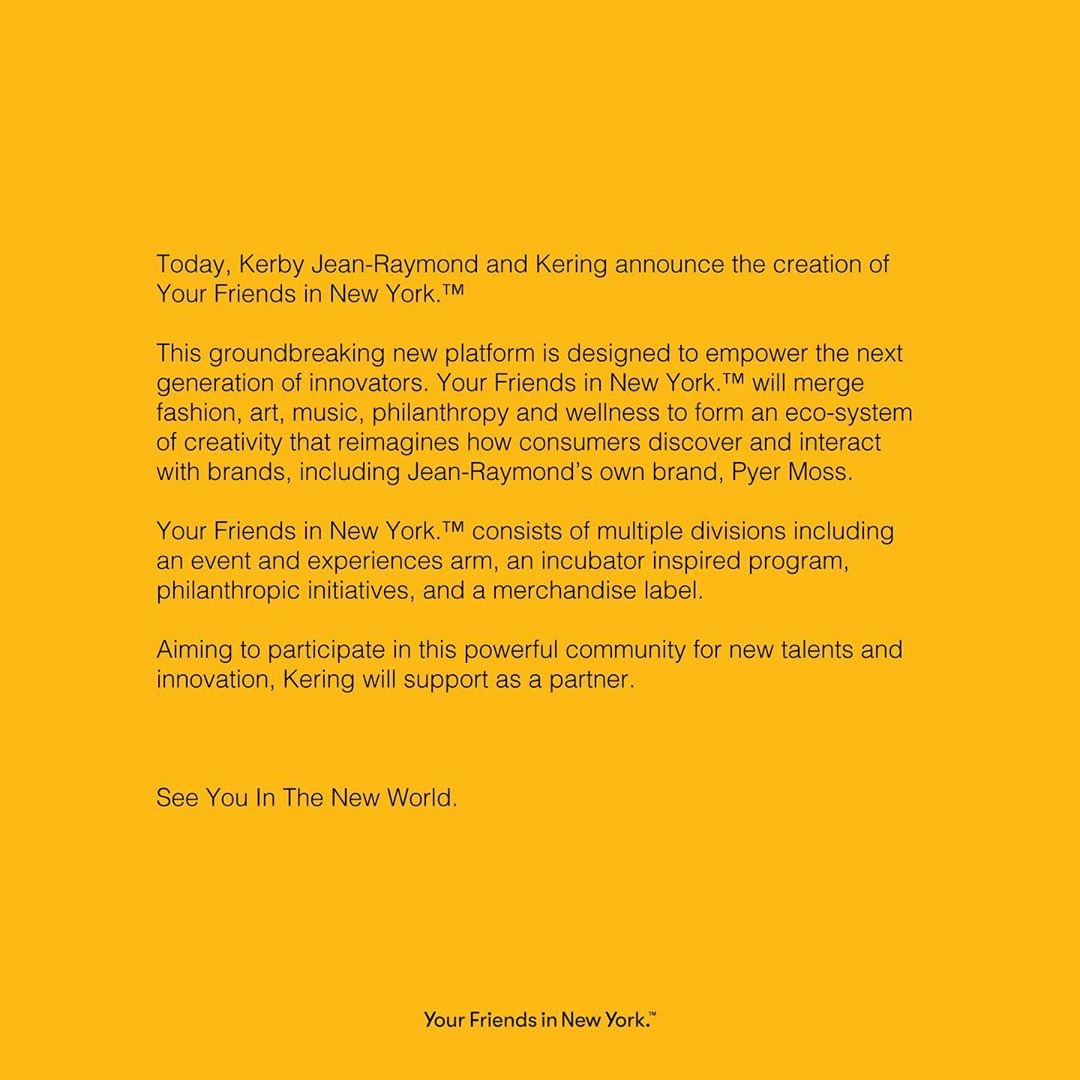 Just in, Pyer Moss designer Kerby Jean-Raymond and French luxury goods company Kering just announced the launch of “Your Friends in New York”, a new platform where creatives in fashion, music, and art come together to incubate and empower their talents as the next generation of innovators.