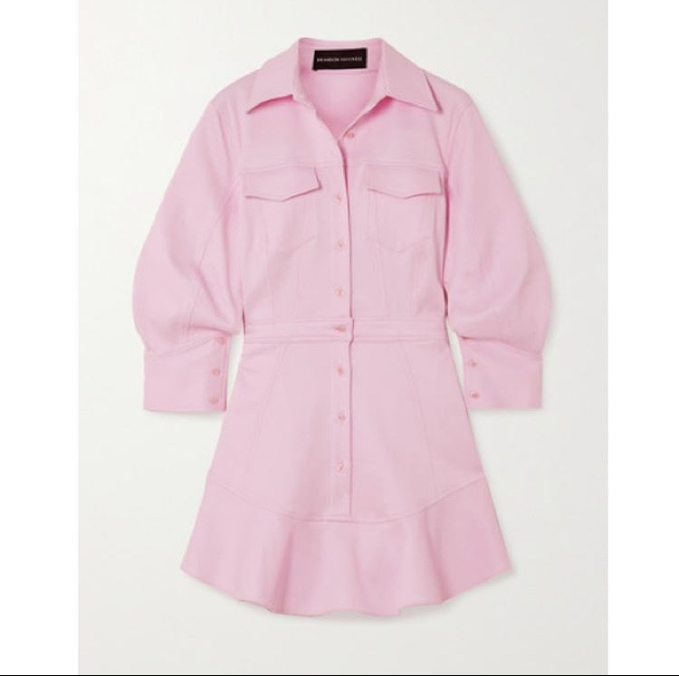“Brandon Maxwell’s mini dress is perfect for both daytime garden parties and evening dinner dates. Made from breathable cotton-blend piqué in a pretty light-pink hue, it has voluminous lantern sleeves and a fluttery ruffled hem.“- Net-A-Porter
