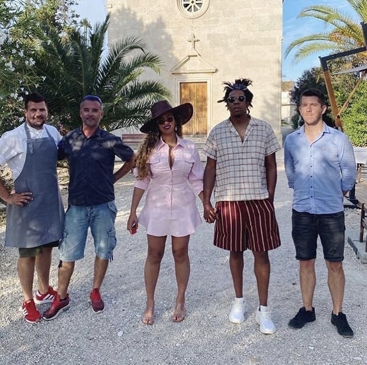 While on vacation in Croatia, Beyonce posed next to her husband, Jay Z, and friends wearing a Pink Pastel 1,595 Brandon Maxwell T Shirt dress.