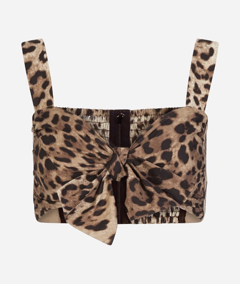 Her top has a Leopard motif, a Front decorative bow, and a Sweetheart neckline.