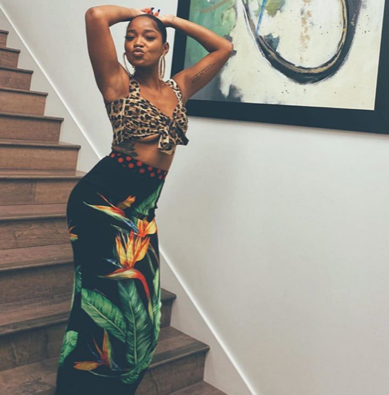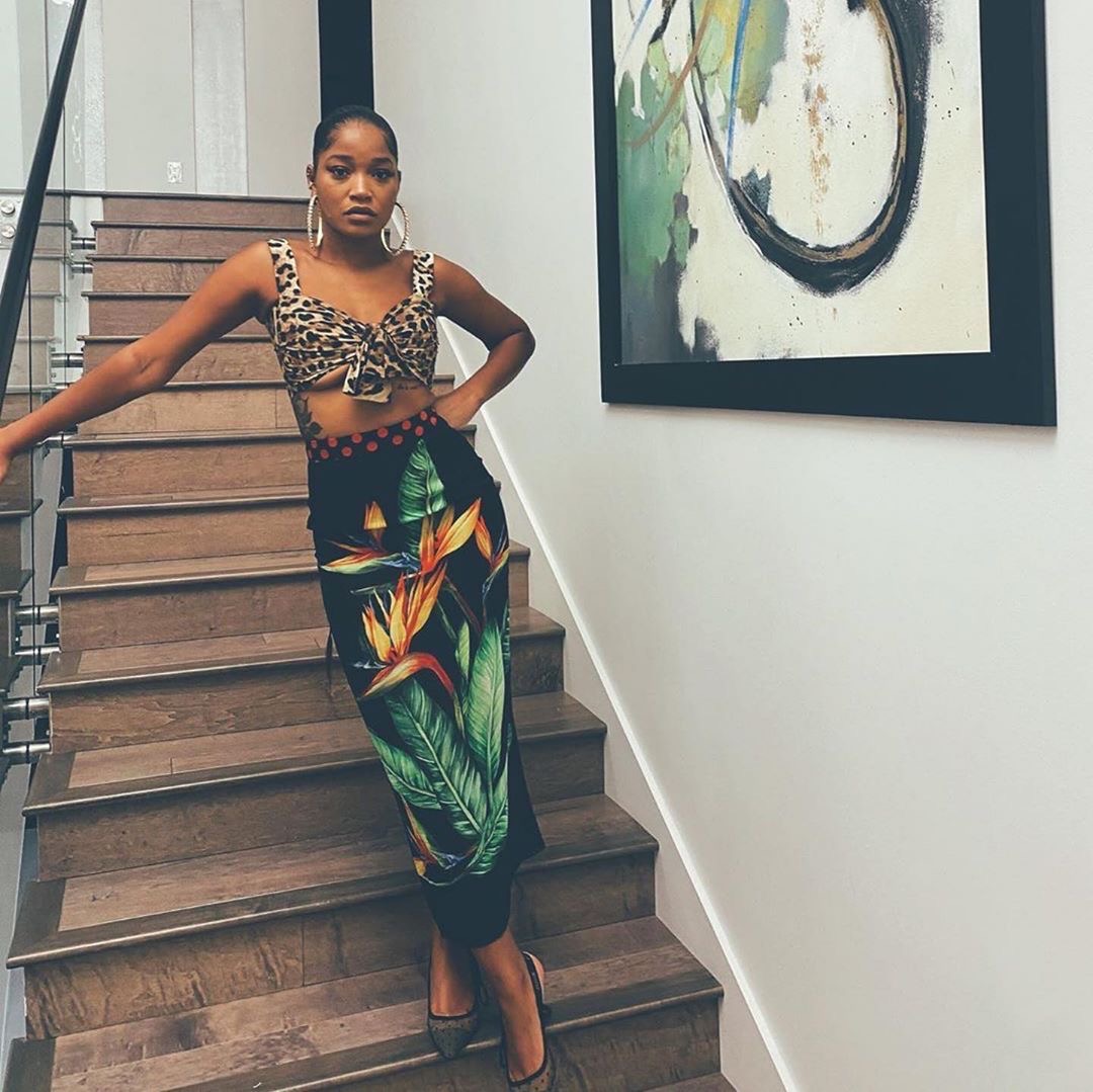 Keke Palmer was spotted on the ‘gram in a $625 Dolce & Gabbana Poplin top with leopard print and a $1,245 Lightweight longuette tube skirt with bird of paradise print, styled by @maikeeb_kills.