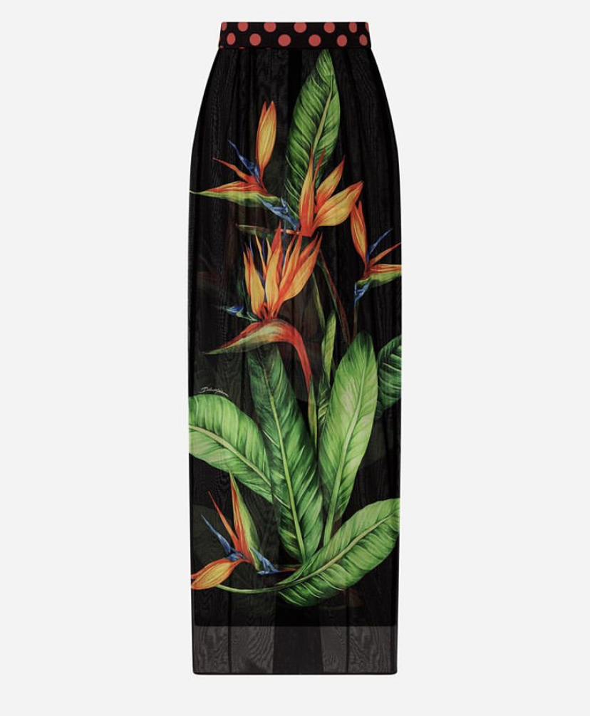 The colorful bird of paradise softens on the evanescent silk veil of this iconic tube skirt.