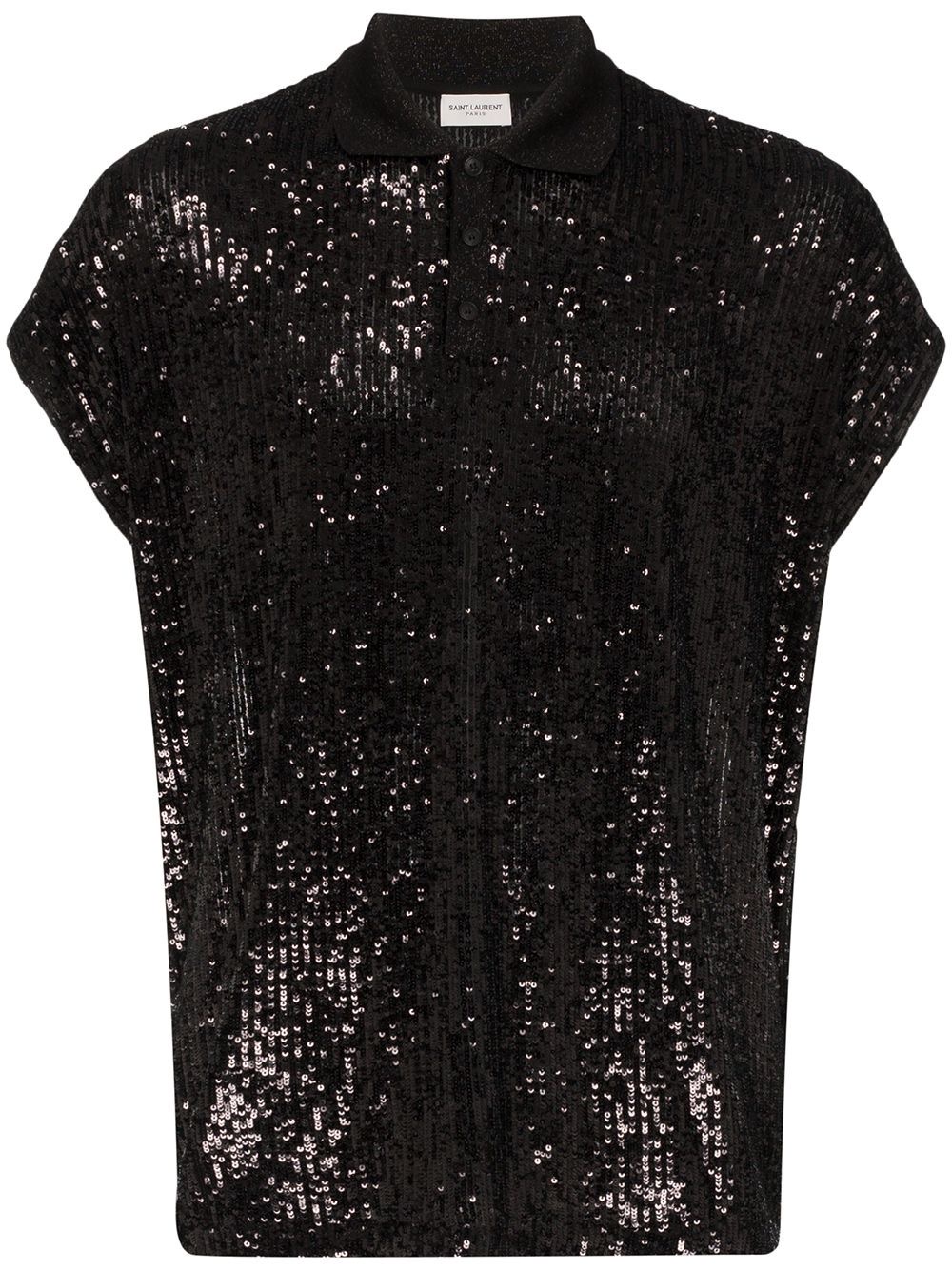 Keeping in the dark, flashy theme, 2 Chainz wore a sparkly black Yves Saint Laurent T-Shirt similar to this $690 Saint Laurent boxy sequined polo shirt.