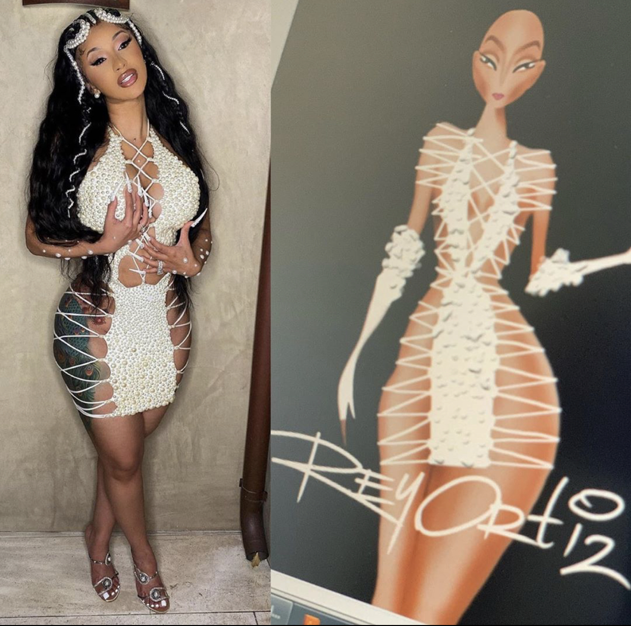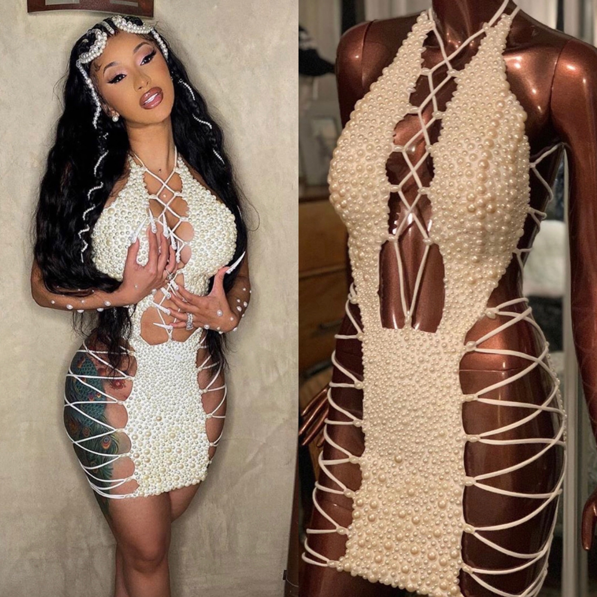 Just yesterday, Cardi B appeared on Instagram giving us yet another bomb look! She resembled a pearly treasure in a custom lace-up dress donned in pearls. Let’s get into her dress details below: