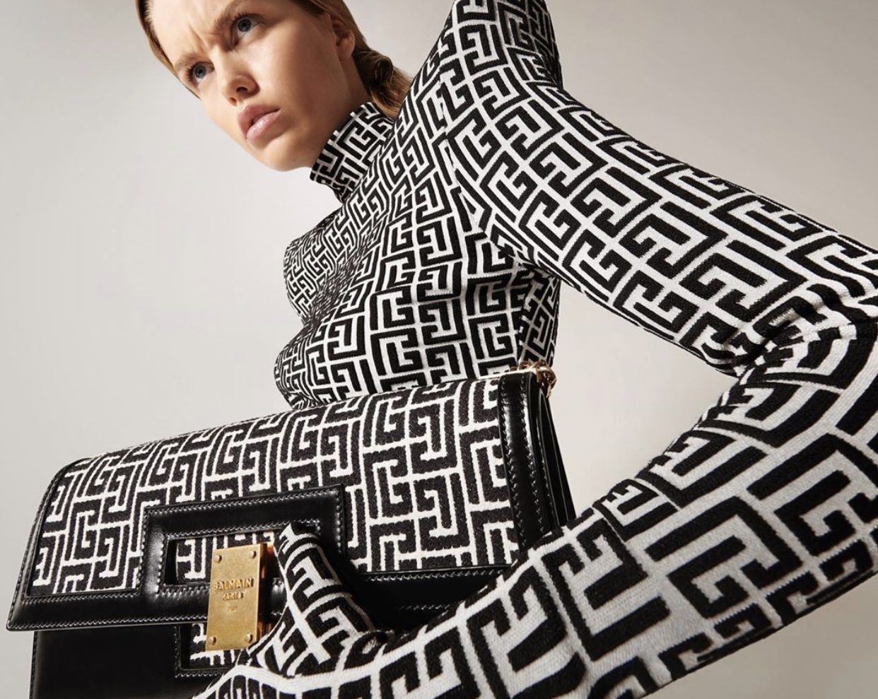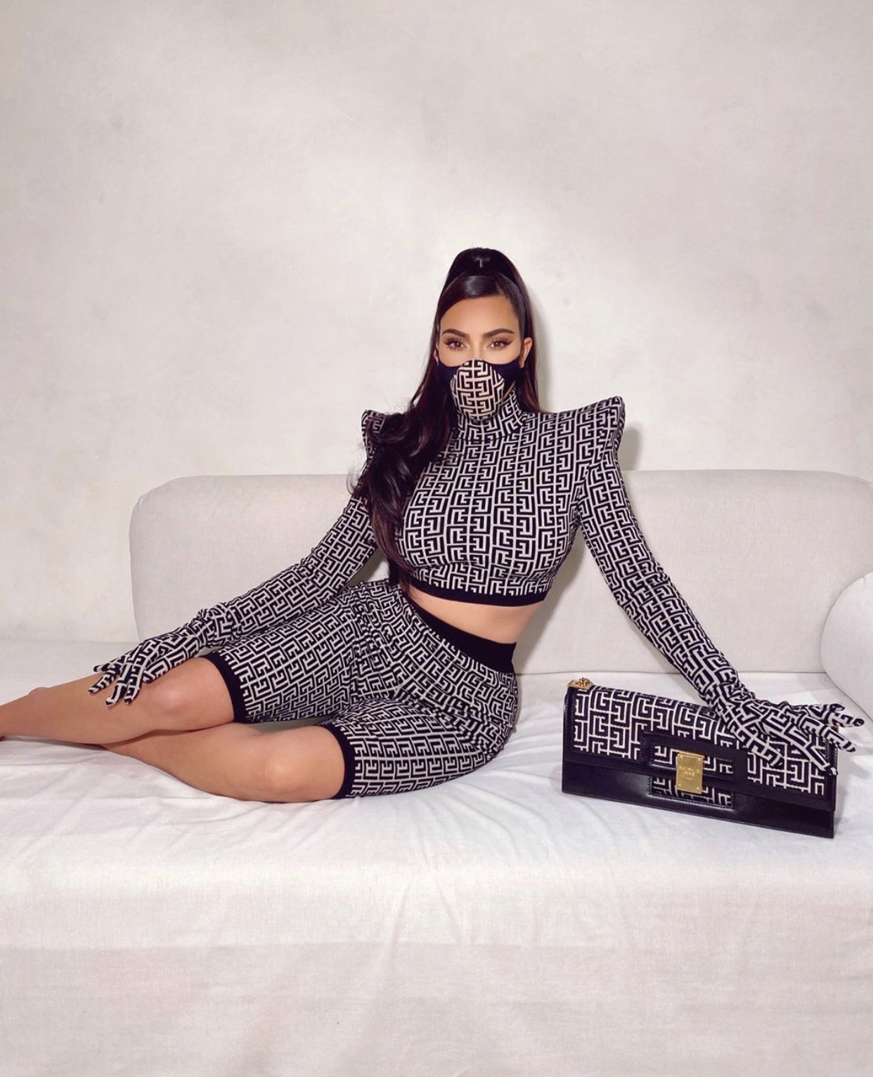 Kim Kardashian wore a Balmain look which featured a bicolor 1945 turtleneck, bicolor 1945 “Bermuda” length shorts, bicolor 1945 “Matinee” length gloves, bicolor 1945 face mask, and a $3,600 Bicolor Jacquard 1945 Baguette Bag. The look comes from Balmain’s latest 1945 collection which pays homage Pierre Balmain’s signature “PB” monogram look from the 1970s. Olivier frequently works with Kim who has become quite a fashion history and archive lover lately. Kim also wore a pair of Yeezy PVC Wedge Thong Sandals with the look (sold out).