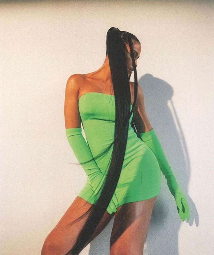 Cassie’s hair added to this look, as she wore two pigtails that flowed past the hem of the dress. The middle part was enhanced with a row of rhinestones and was done by Tiger. Check out a behind the scenes look of Cassie and her glam squad as she prepares for this shoot.