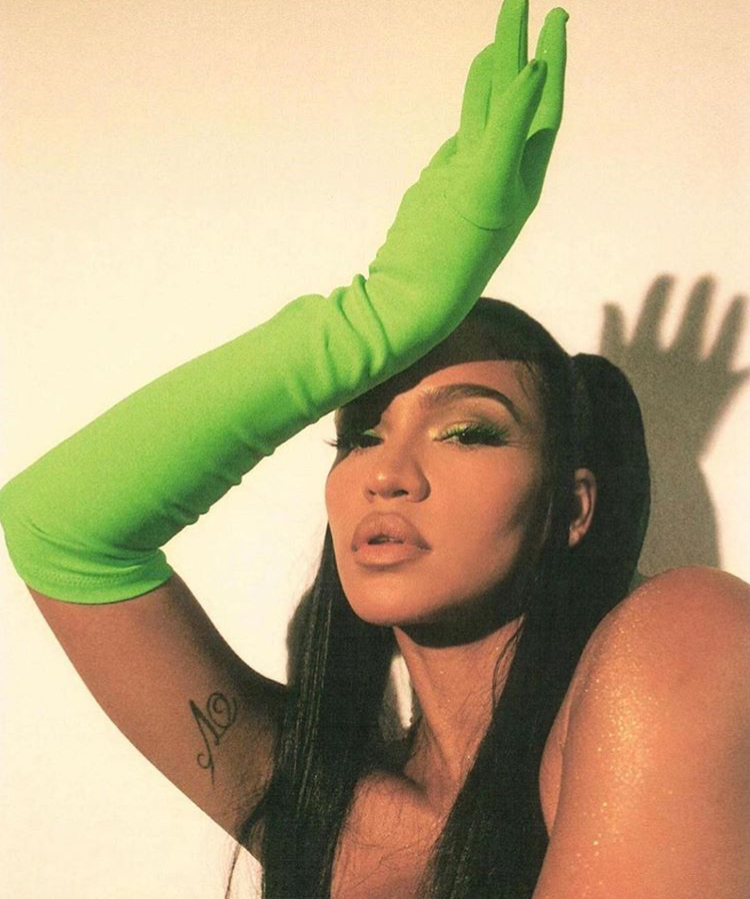 Cassie posed for a photo shoot wearing Miscreants “Cupid” green strapless dress. The dress is made of 100% lightweight scuba and comes in a variety of colors and different styles. It was paired with long matching gloves also from Miscreants, that extends up the arm past the elbow.