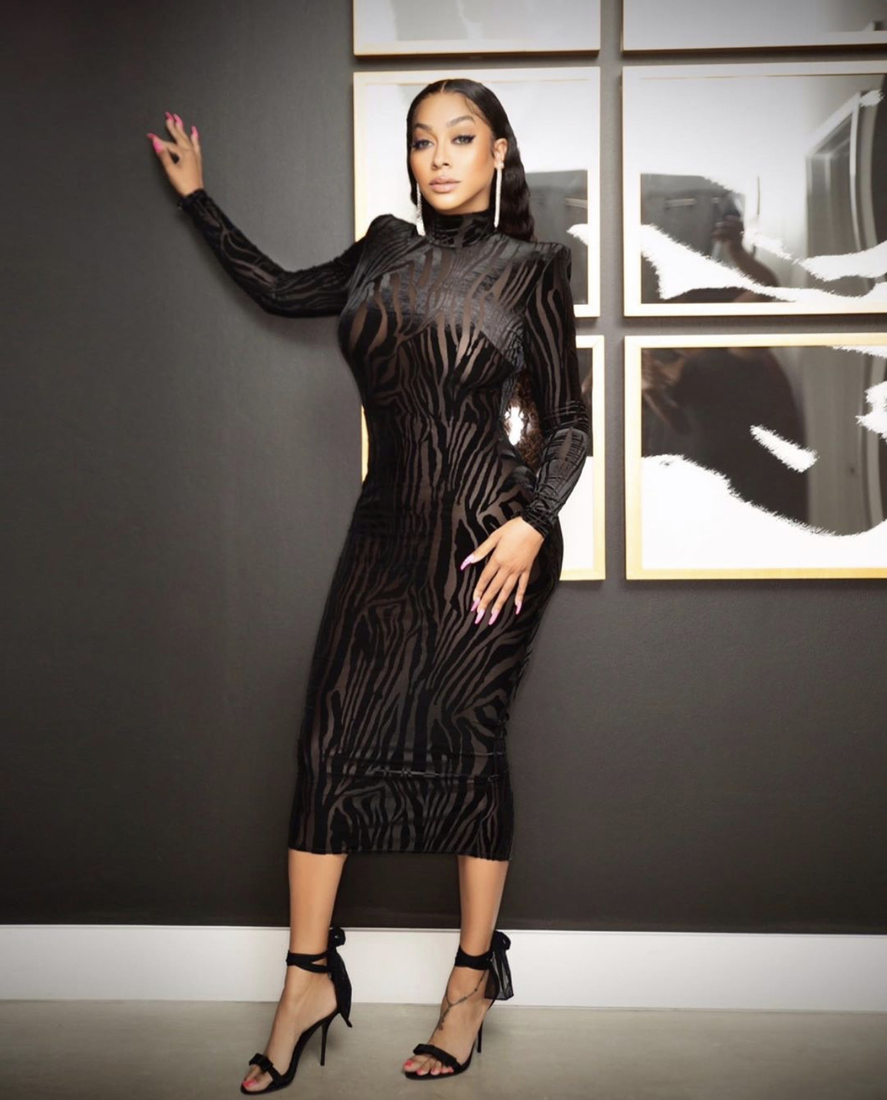 Lala stunned in $1,600 Alex Perry “Hadley” black velvet dress, $698 Dolce and Gabbana “Keira” Sandals. Shop her look below: