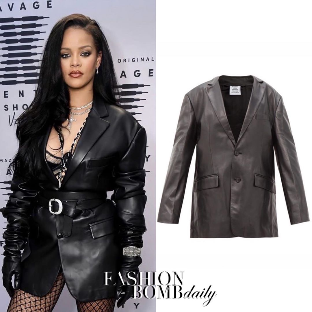 Rihanna was spotted in $3,690 Vetements single breasted leather jacket (Fall 2020 Menswear) with Savage X Fenty fishnet garment.