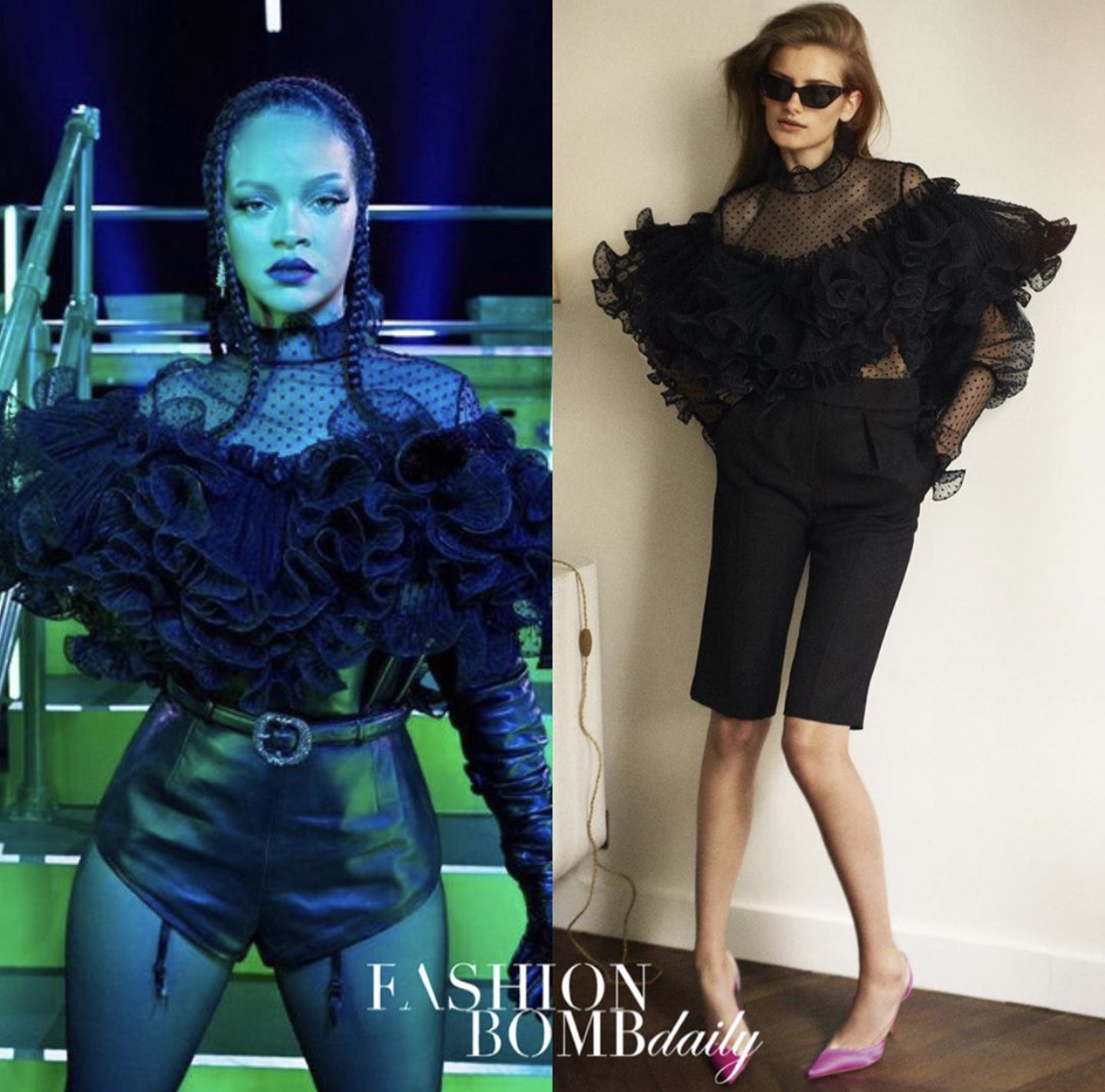 Rihanna also wore a Alexandre Vauthier Fall/Winter 2020 Couture top and hot pants paired with Chrome Hearts jewelry and accessories along with Savage X Fenty garters and tights!