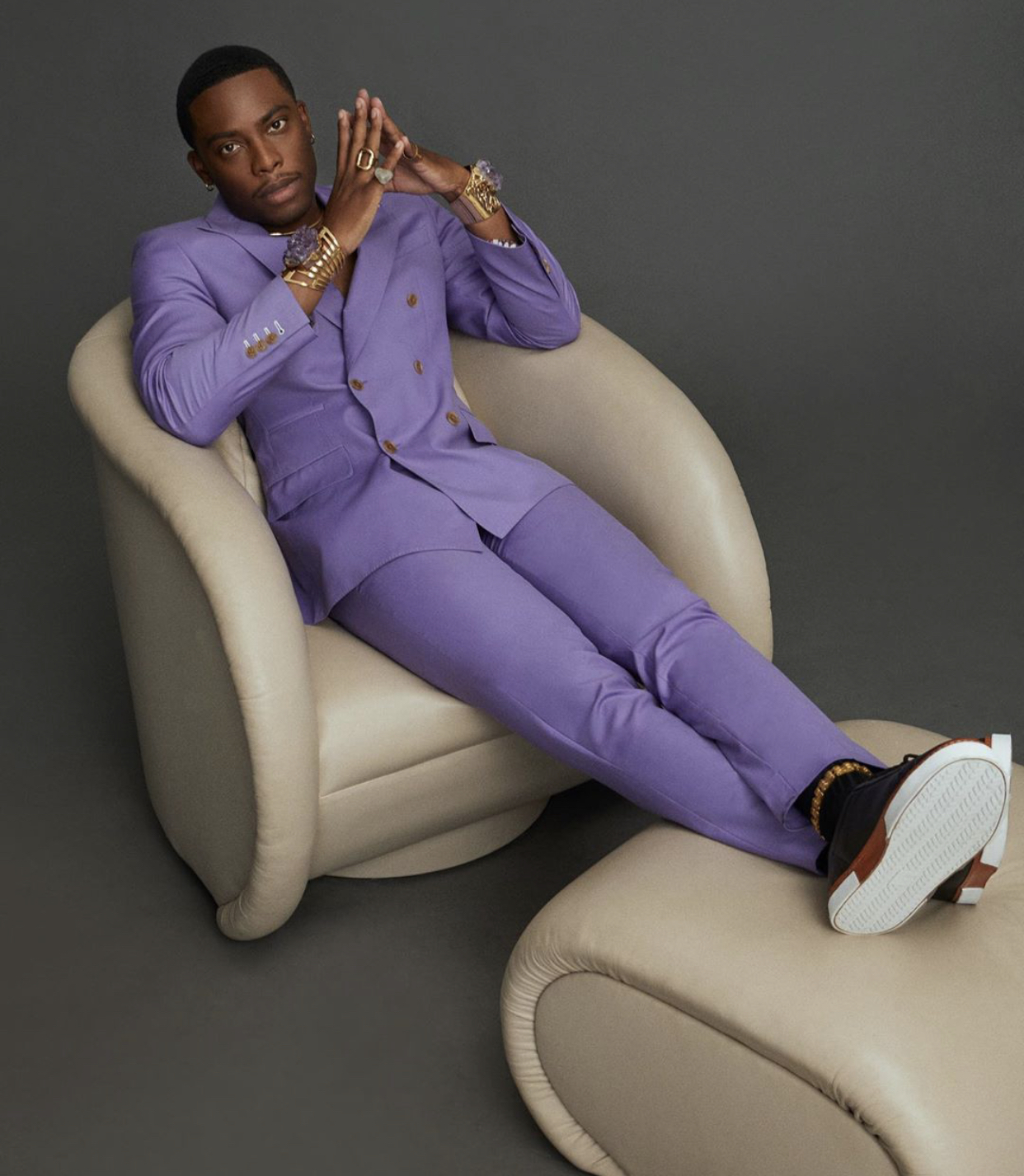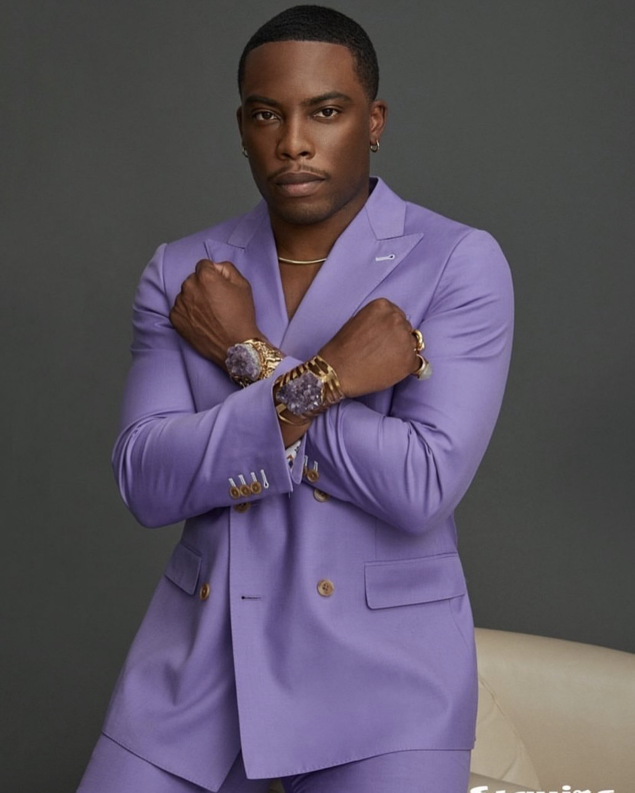 Woody McClain posed in a lavender double breasted suit by Garçon Couture and Jovana Louis amethyst bracelets, styled by Mickey Freeman. Garcon Couture is a menswear brand headed by two Black designers, Jean Francillon and Ilbert J. Sanchez. Jovana Louis is a self-named womenswear brand led by Haitian-born designer Jovana Louis that has been spotted on celebrities like Garcelle Beauvais, Dascha Polanco and Janet Jackson. Bomb!