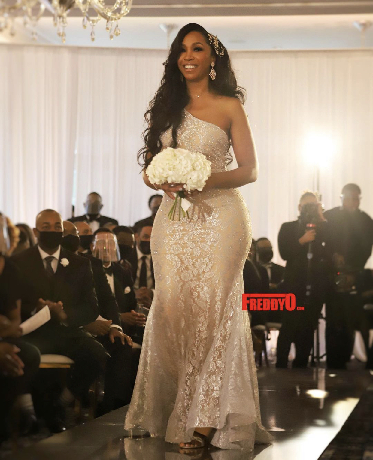 Cynthia Bailey looked captivating in her pink sequin wedding gown and white reception dress which were both designed by Brides by Nona Couture Atelier.