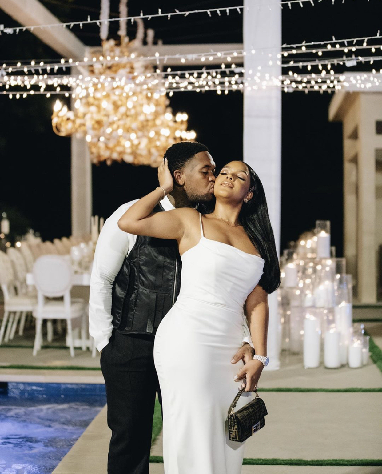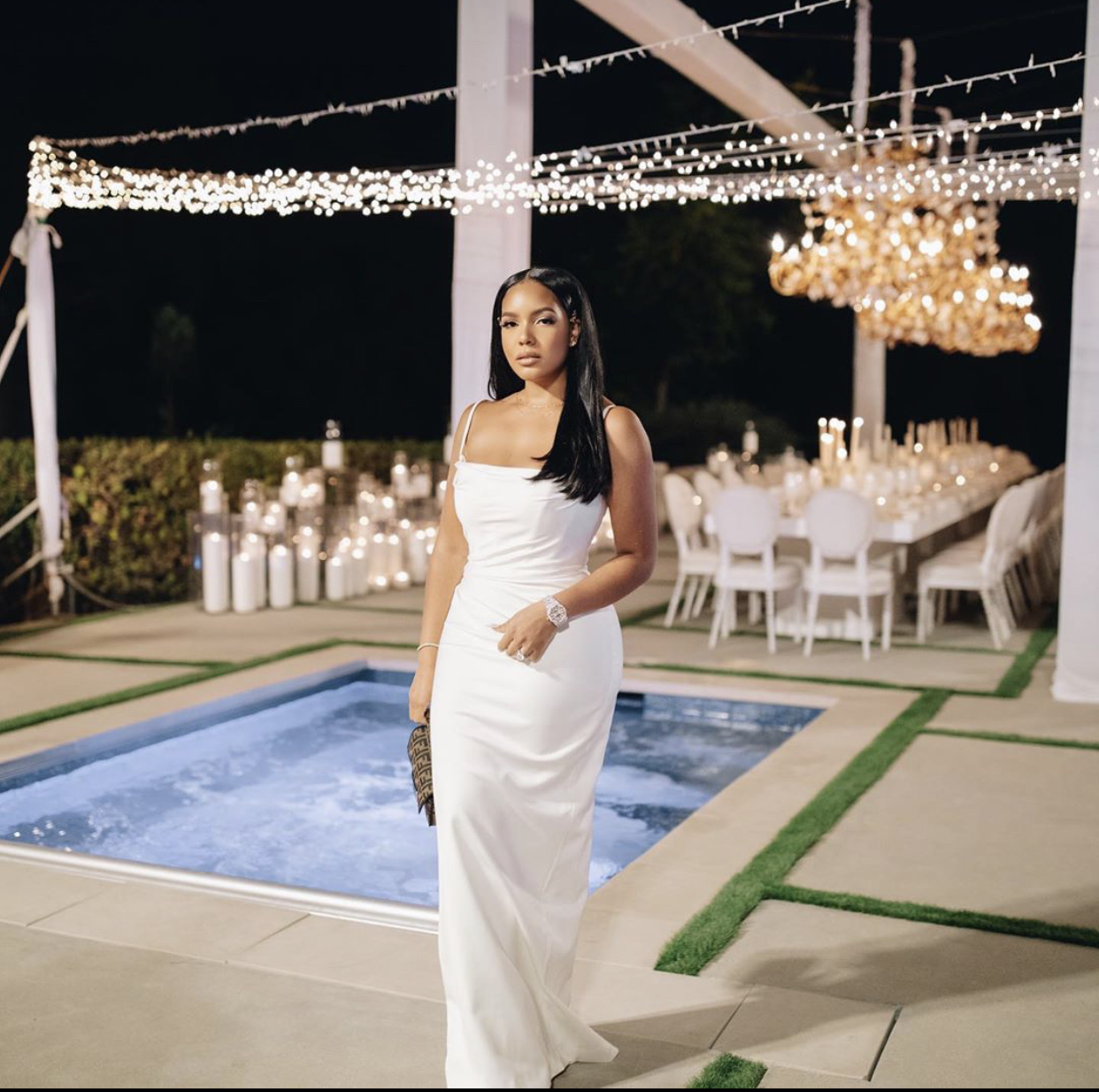 Chanel McFarlene wore the $899 House of CB “Margaux” dress from their bridal collection. The dress appeared in ivory and featured delicate draping to accentuate her overall physique. She paired the dress with Fendi’s Mini Baguette Bag.